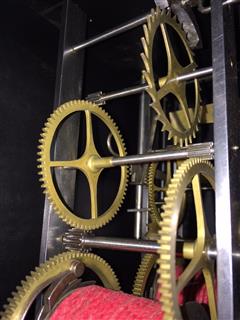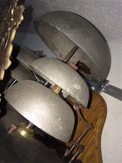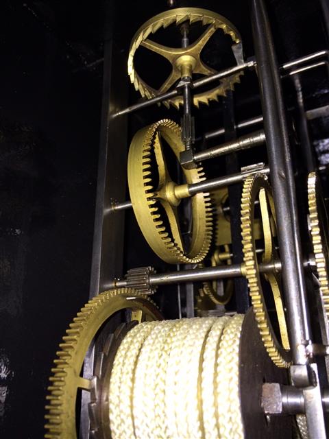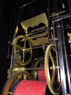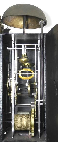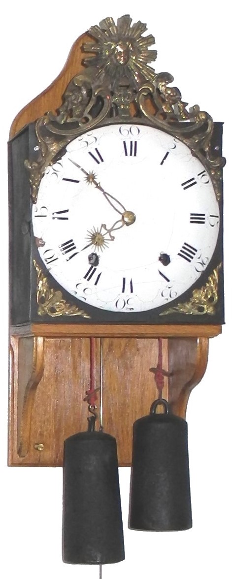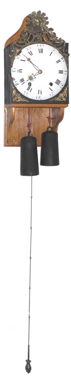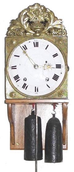 | - Nombre de cloches : une cloche unique - Balancier : situé à l'avant des poids sur cheminée - Type de balancier : lentille (120mm) sur tige pliante - Type de suspension : ficelle ou fil - Autonomie : 8 jours - Tambours : bois avec couverture en laiton - Portes latérales : Portes et tôle arrière sans décor (fer laminé)