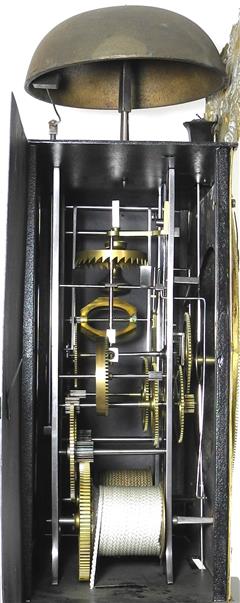 | - Type de mouvement : 2 aiguilles en laiton découpé (heures / minutes) - Taille du mouvement : 9 pouces (243mm) - Type de cadran : émaillé bombé - Style du fronton : Laiton estampé (en 2 pièces) - Type d'échappement : à verge (à roue de rencontre) - Architecture : 2 corps de rouages (piliers) - Sonnerie : sur cloche - Particularité sonnerie : répétition des heures & sonnerie des demies sur marteau séparé