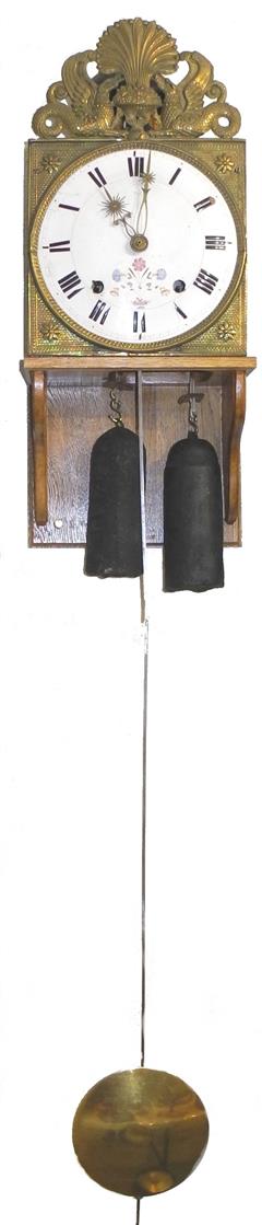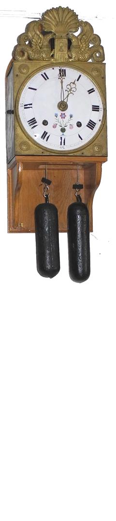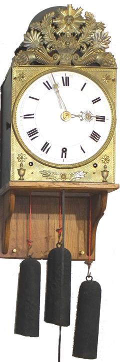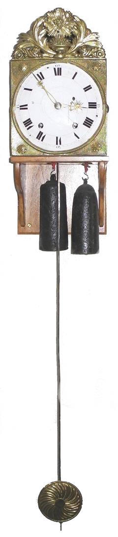 | - Type de mouvement : 2 aiguilles en laiton découpé (heures / minutes) - Taille du mouvement : 9 pouces (243mm) - Type de cadran : émaillé bombé - Style du fronton : Laiton estampé (en 2 pièces) - Type d'échappement : à verge (à roue de rencontre) - Architecture : 2 corps de rouages (piliers) - Sonnerie : sur cloche - Particularité sonnerie : répétition des heures & sonnerie des demies sur marteau principal | - Nombre de cloches : une cloche unique - Balancier : situé à l'avant des poids sur cheminée - Type de balancier : lentille (120mm) sur tige pliante - Type de suspension : ficelle ou fil - Autonomie : 8 jours - Tambours : complêtement en laiton - Portes latérales : Portes et tôle arrière sans décor (fer laminé) - Complication : réveil matin - Remarques : éclat du cadran à 4 heures. |