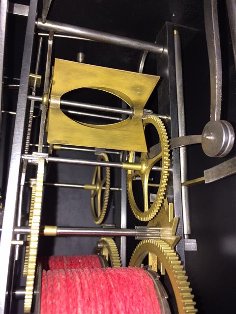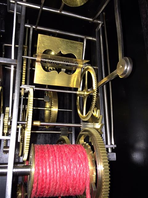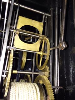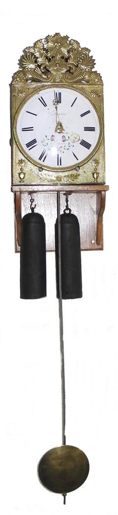 | - Balancier : situé à l'arrière des poids sur cheminée (0-10cm haut) - Type de balancier : chaine d'arpenteur avec plomb - Type de suspension : ficelle ou fil - Autonomie : 8 jours - Tambours : bois - Portes latérales : Portes et tôle arrière sans décor (fer forgé et martelé) - Décoration : ornement des coins inférieurs - Remarques : Aiguilles non d'origines (devraient être en laiton scié)