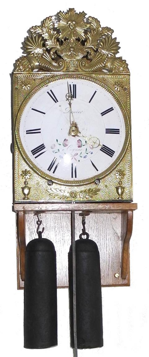 | - Type de mouvement : 2 aiguilles en laiton découpé (heures / minutes) - Taille du mouvement : 10 pouces (270mm) - Type de cadran : émaillé bombé - Style du fronton : Laiton estampé (en 2 pièces) - Type d'échappement : à verge (à roue de rencontre) - Architecture : 2 corps de rouages (piliers) - Sonnerie : sur cloche - Particularité sonnerie : répétition des heures & sonnerie des demies sur marteau principal. | - Nombre de cloches : une cloche unique - Balancier : situé à l'avant des poids sur cheminée - Type de balancier : lentille (120mm) sur tige pliante - Type de suspension : ficelle ou fil - Autonomie : 30 jours (mensuel) - Tambours : complêtement en laiton - Portes latérales : Portes et tôle arrière en tôle lisse sans décor - Remarques : éclat du cadran au centre |
