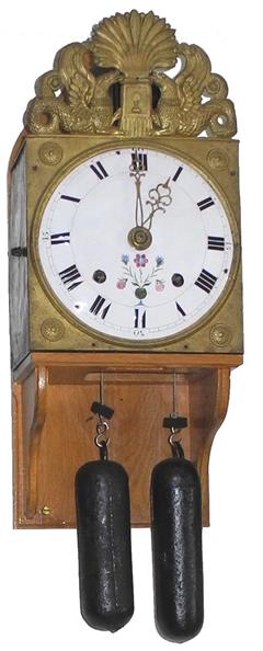 | - Type de mouvement : 2 aiguilles en laiton découpé (heures / minutes) - Taille du mouvement : 9 pouces (243mm) - Type de cadran : émaillé bombé - Style du fronton : Laiton estampé (en 2 pièces) - Type d'échappement : à ancre - Architecture : 2 corps de rouages (piliers) - Sonnerie : sur cloche - Particularité sonnerie : répétition des heures & sonnerie des demies sur marteau principal | - Nombre de cloches : une cloche unique - Balancier : situé à l'avant des poids sur cheminée - Type de balancier : lentille (120mm) sur tige pliante - Type de suspension : ficelle ou fil - Autonomie : 8 jours - Tambours : bois - Portes latérales : Portes et tôle arrière sans décor (fer laminé)