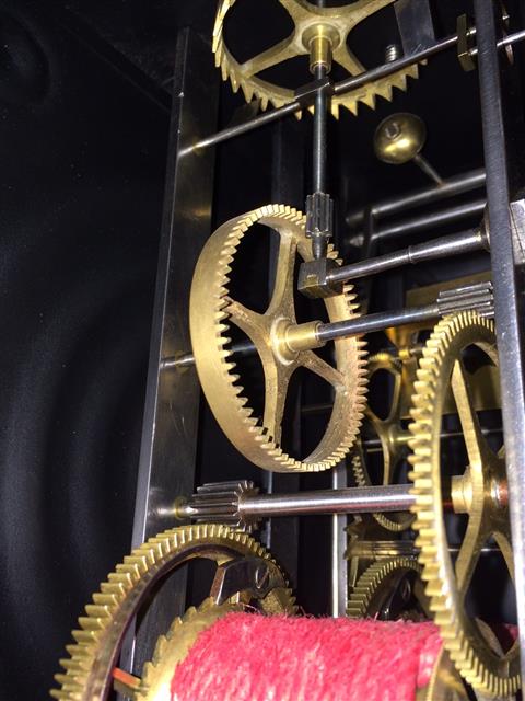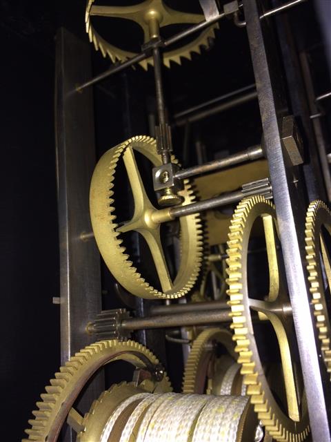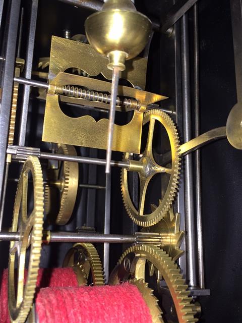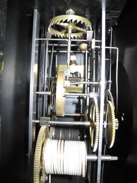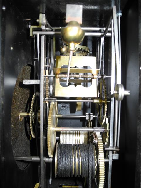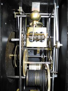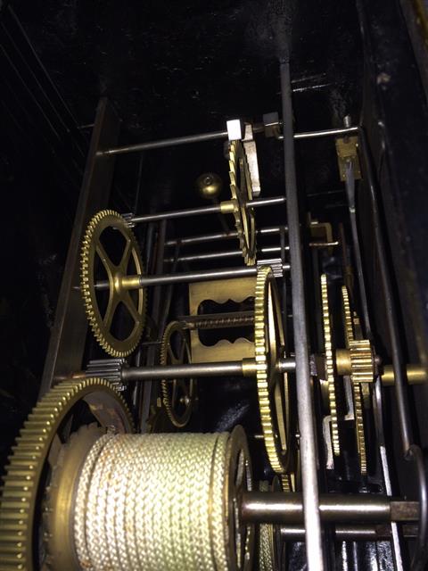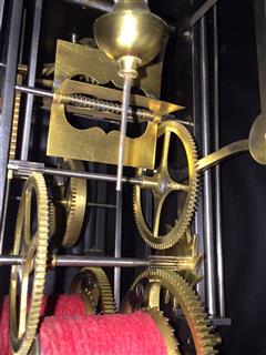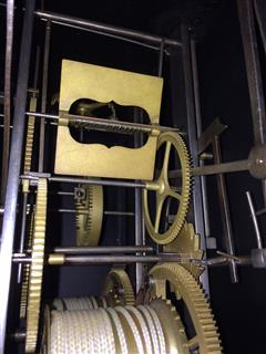 | - Type de mouvement : 2 aiguilles en laiton découpé (heures / minutes) & 1 aiguille (date) - Taille du mouvement : 9 pouces (243mm) - Type de cadran : émaillé bombé - Style du fronton : Laiton estampé (une seule pièce) - Type d'échappement : à verge (à roue de rencontre) - Architecture : 2 corps de rouages (piliers) - Sonnerie : sur cloche - Particularité sonnerie : répétition des heures & sonnerie des demies sur marteau principal