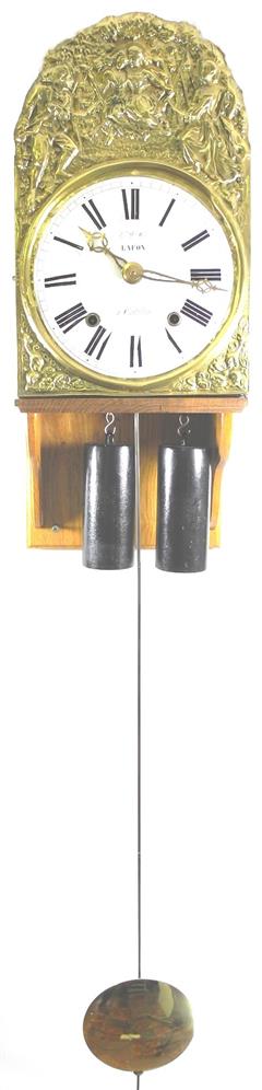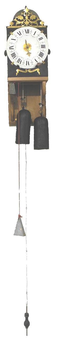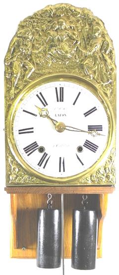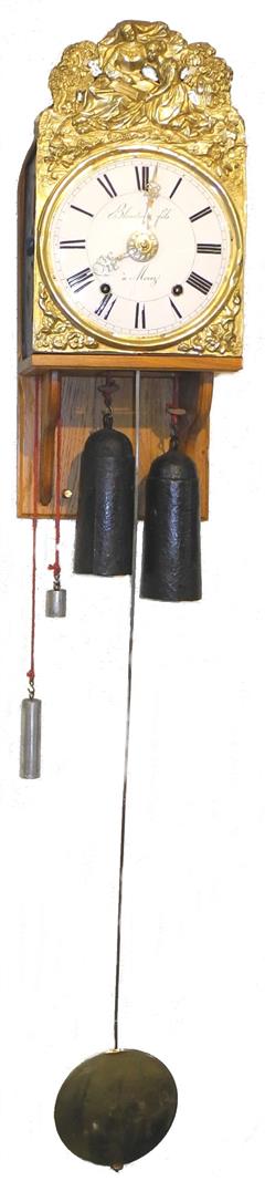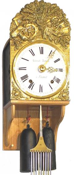 | - Type de mouvement : 2 aiguilles en laiton découpé (heures / minutes) - Taille du mouvement : 10 pouces (270mm) - Type de cadran : émaillé bombé - Style du fronton : Laiton estampé (en 2 pièces) - Type d'échappement : à verge (à roue de rencontre) - Architecture : 2 corps de rouages (piliers) - Sonnerie : sur cloches - Particularité sonnerie : sonnerie des quarts
