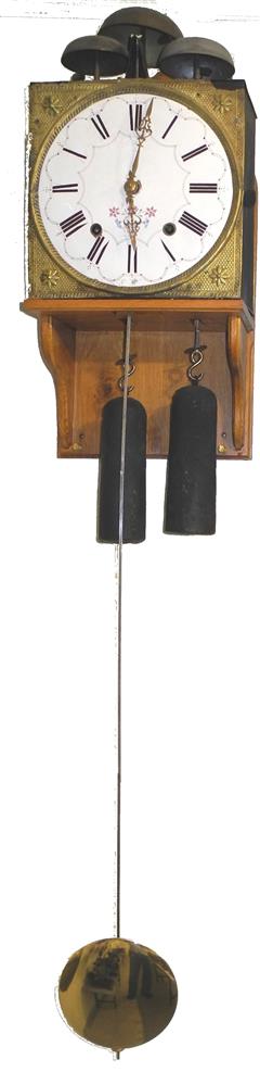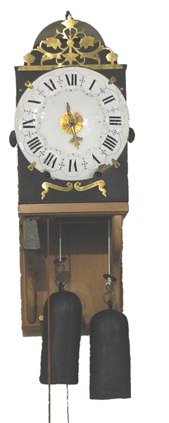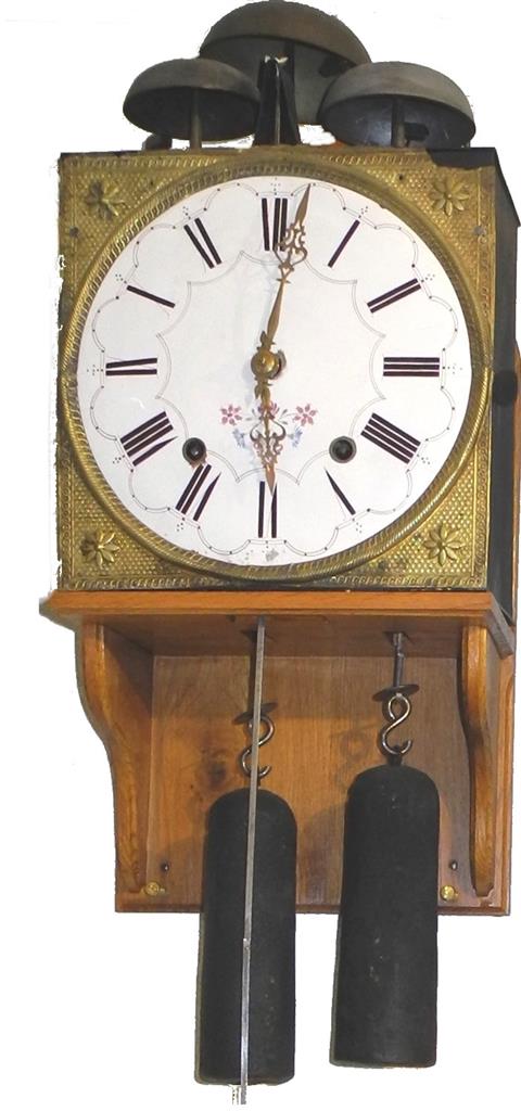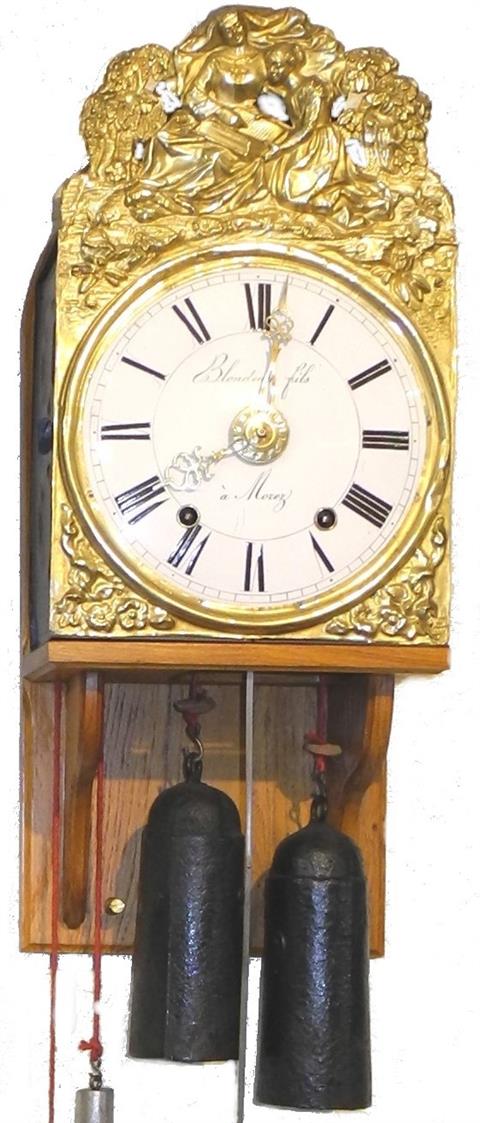 | - Nombre de cloches : 3 cloches - Balancier : situé à l'avant des poids sur cheminée - Type de balancier : lentille (120mm) sur tige pliante - Type de suspension : ficelle ou fil - Autonomie : 8 jours - Tambours : complêtement en laiton - Portes latérales : Portes et tôle arrière en tôle lisse sans décor