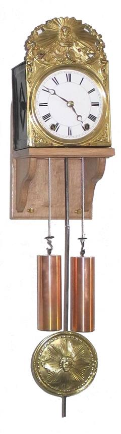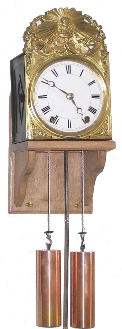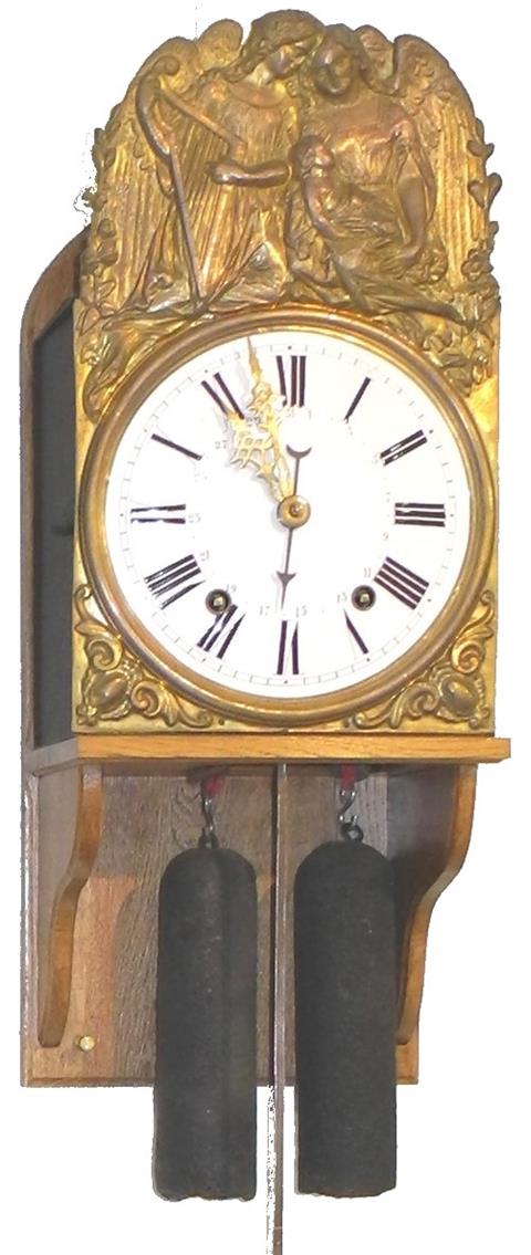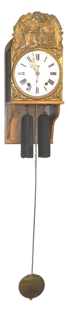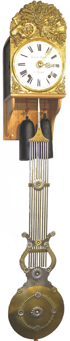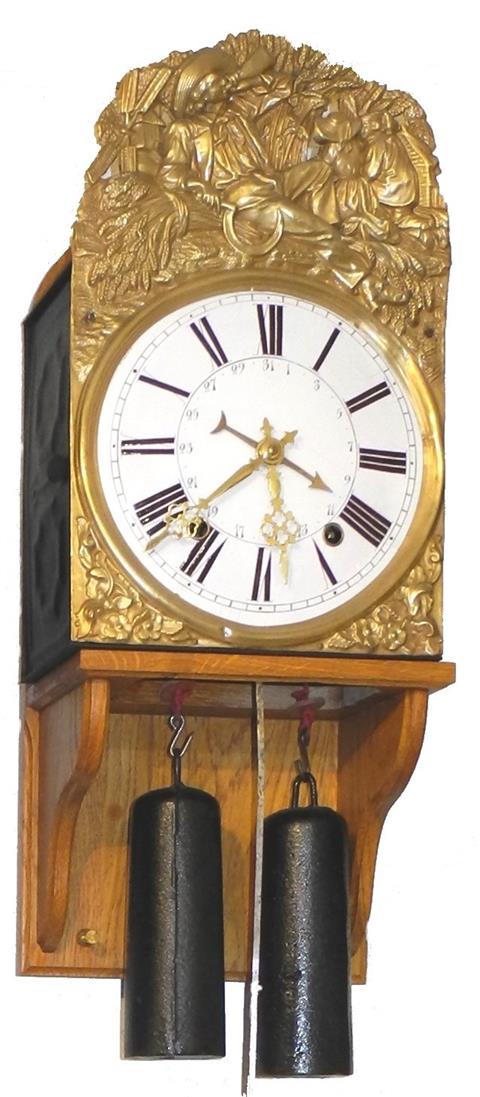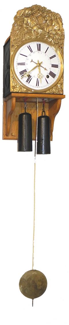 | - Nombre de cloches : une cloche unique - Balancier : situé à l'avant des poids (sans cheminée) - Type de balancier : lentille (120mm) sur tige pliante - Type de suspension : ressort - Autonomie : 8 jours - Tambours : complêtement en laiton - Portes latérales : Portes ornées de formes estampées - Complication : quantième (jour du mois)