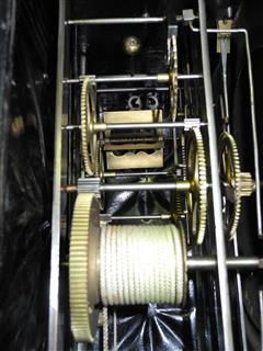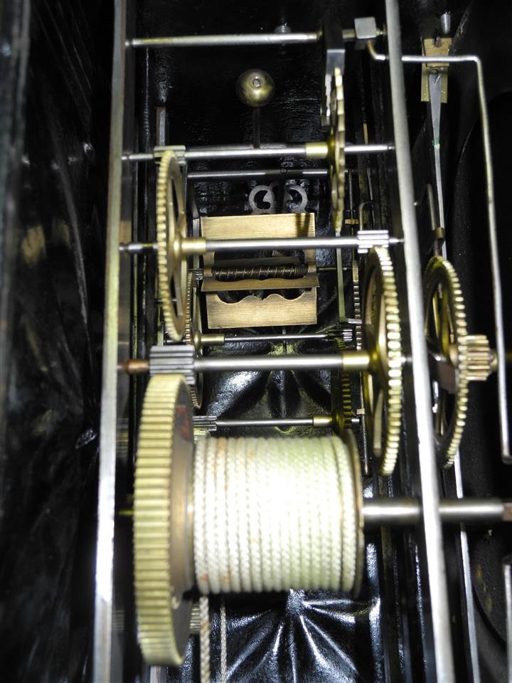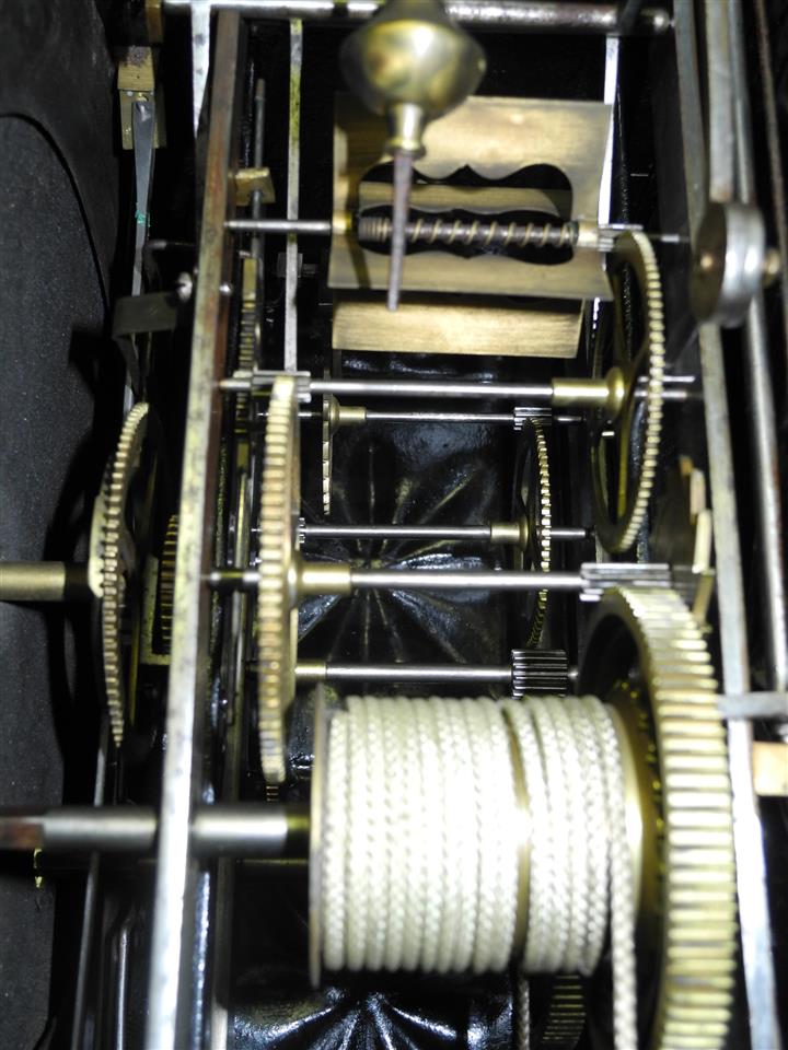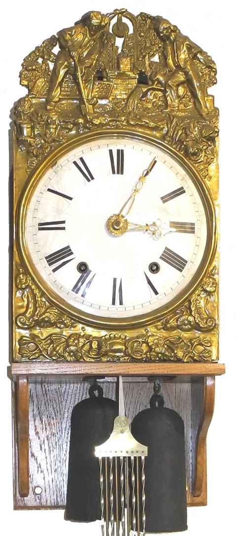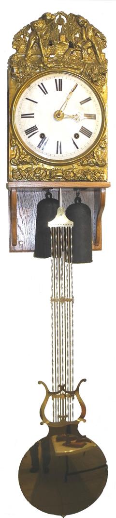 | - Type de mouvement : 2 aiguilles en laiton découpé (heures / minutes) - Taille du mouvement : 10 pouces (270mm) - Type de cadran : émaillé bombé - Style du fronton : Laiton estampé (une seule pièce) - Type d'échappement : à ancre - Architecture : 2 corps de rouages (piliers) - Sonnerie : sur cloche - Particularité sonnerie : répétition des heures & sonnerie des demies sur marteau principal | - Nombre de cloches : une cloche unique - Balancier : situé à l'avant des poids (sans cheminée) - Type de balancier : chaine d'arpenteur avec plomb - Type de suspension : lyre (220mm) - Autonomie : 8 jours - Tambours : complêtement en laiton - Portes latérales : Portes ornées de formes estampées